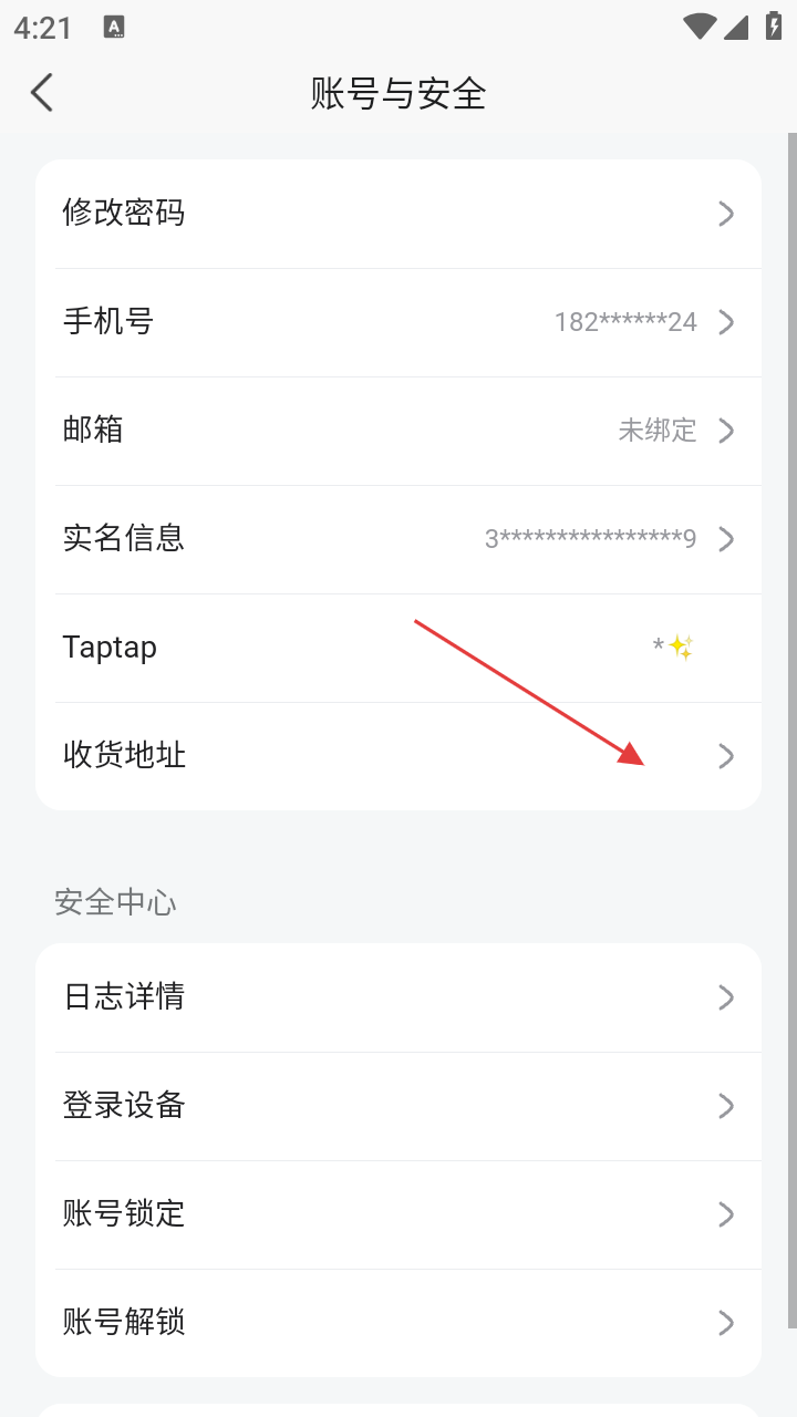 4、在账号与安全界面,点击【收货地址】选项,可进行收货地址的添加或修改操作,方便接收官方周边等物品。