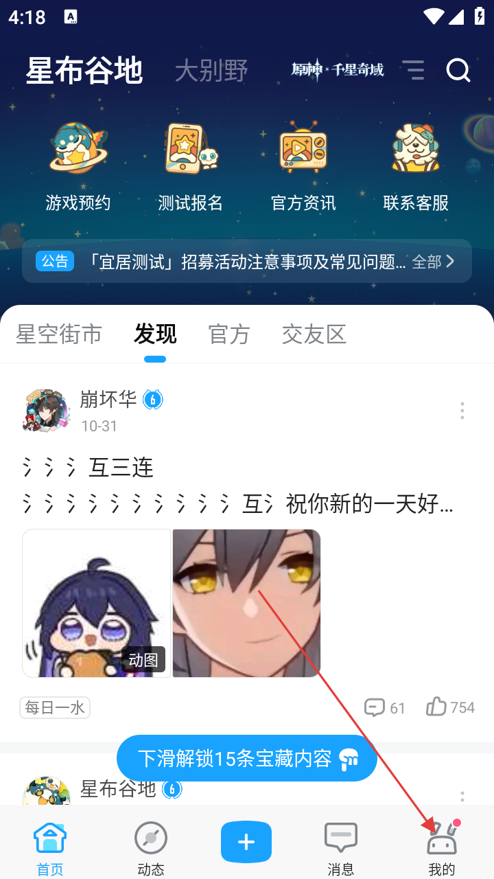 1、在米游社首页,点击右下角【我的】,可进入个人相关界面,界面展示有登录入口、兑换中心等功能。